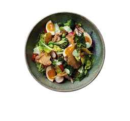 Marinated chicken and soy egg on a salad of green leaves, red cabbage, quinoa, tomatoes, edamame, avocado, radish, broccoli & sesame