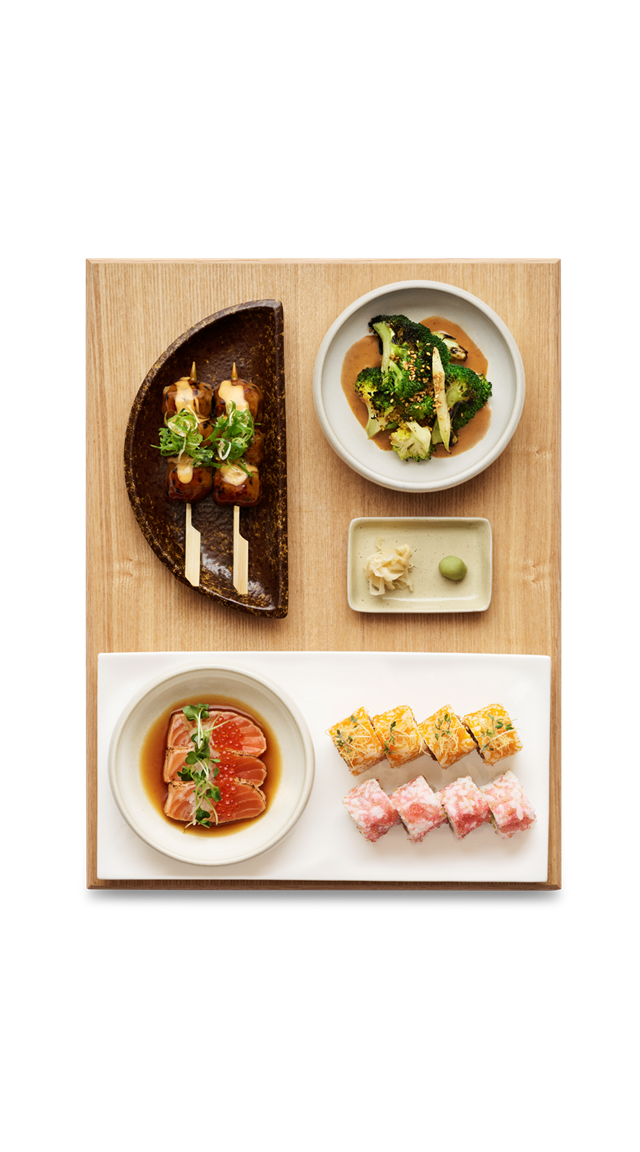 Bites. Broccoli. Shake Tataki Maki. Spicy Tuna. Pink Alaska Sticks. Tsukune Chili