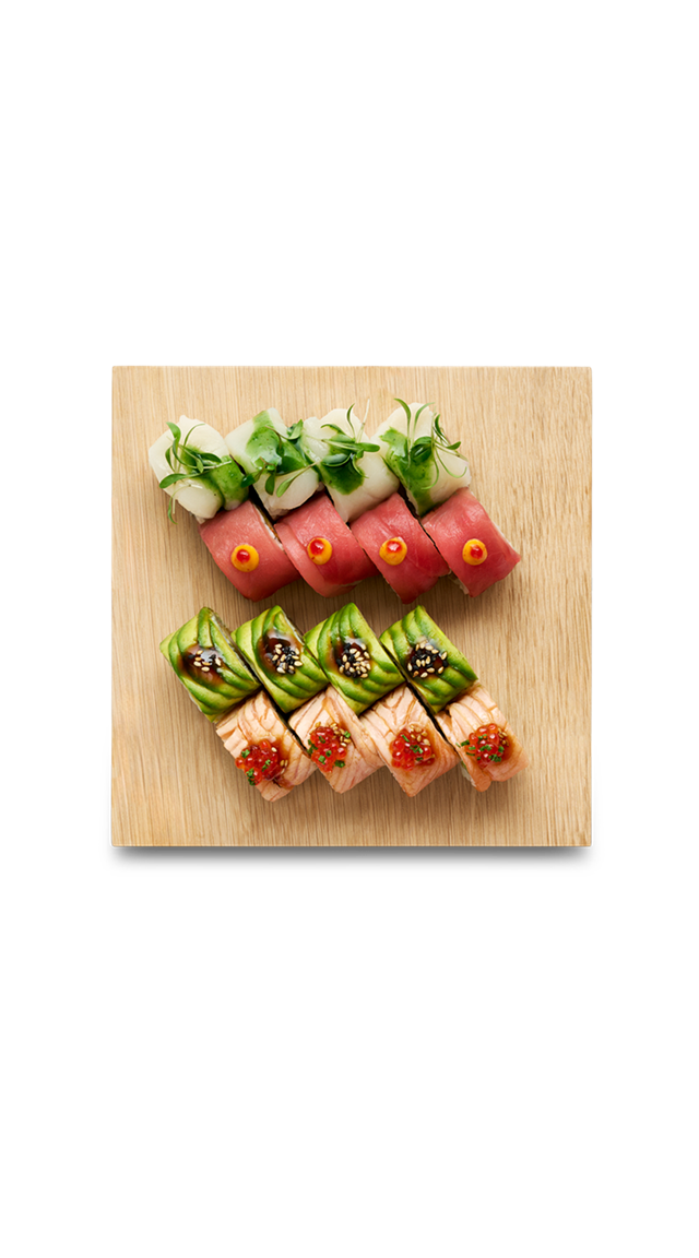 Shake Aïoli maki with snow peas, avocado, miso aïoli & cucumber, topped with seared salmon & trout roe.